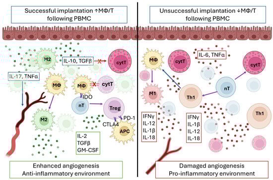 When comparing the post-PBMC endometrial immune profiles, a significant increase in the endometrial MΦ/T ratio was observed in the group with improved endometrial receptivity following PBMC administration. Our previous study identified this ratio as a sensitive indicator of receptivity []. The crosstalk between macrophages and T lymphocytes is central to endometrial regulation and embryo acceptance as mentioned. In cases of failed implantation, the shifted balance between macrophages to T lymphocytes may lead to a shift in the immune profile towards cytotoxicity. More specifically, CD68+ macrophages undergo phenotypic change into pro-inflammatory macrophages, in turn influencing naïve T cells to convert into cytotoxic T lymphocytes or T helper cells secreting pro-inflammatory cytokines. In this context, the endometrial environment, enriched in cytokines such as IFNγ, IL-12, IL-1β, IL-18, IL-6, and TNFα, turns pro-inflammatory, hindering embryo implantation and damaging angiogenesis (Figure 7).
