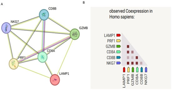 STRING protein–protein interaction (PPI) network of cytotoxicity-related genes (CD107a, CD8A, CD8B, PRF1, GZMB, and NKG7). (A) Nodes represent proteins, and edges represent predicted functional associations (confidence score ≥ 0.7). (B) Co-expression analysis of the same cytotoxicity-related gene set within STRING, darker shades indicate stronger co-expression.