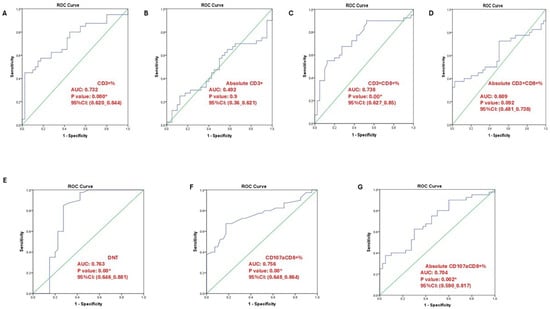 ROC curve analysis illustrating the diagnostic performance of different T-cell subsets. (A) CD3⁺% (AUC = 0.732, p = 0.000); (B) absolute CD3⁺ count (AUC = 0.492, p = 0.900); (C) CD3⁺CD8⁺% (AUC = 0.738, p = 0.000); (D) absolute CD3⁺CD8⁺ count (AUC = 0.609, p = 0.092); (E) double-negative T cells (DNT; AUC = 0.763, p = 0.000); (F) CD107a⁺CD8⁺% (AUC = 0.756, p = 0.000); (G) absolute CD107a⁺CD8⁺ count (AUC = 0.704, p = 0.020). An asterisk (*) indicates statistically significant results at p < 0.05 *.