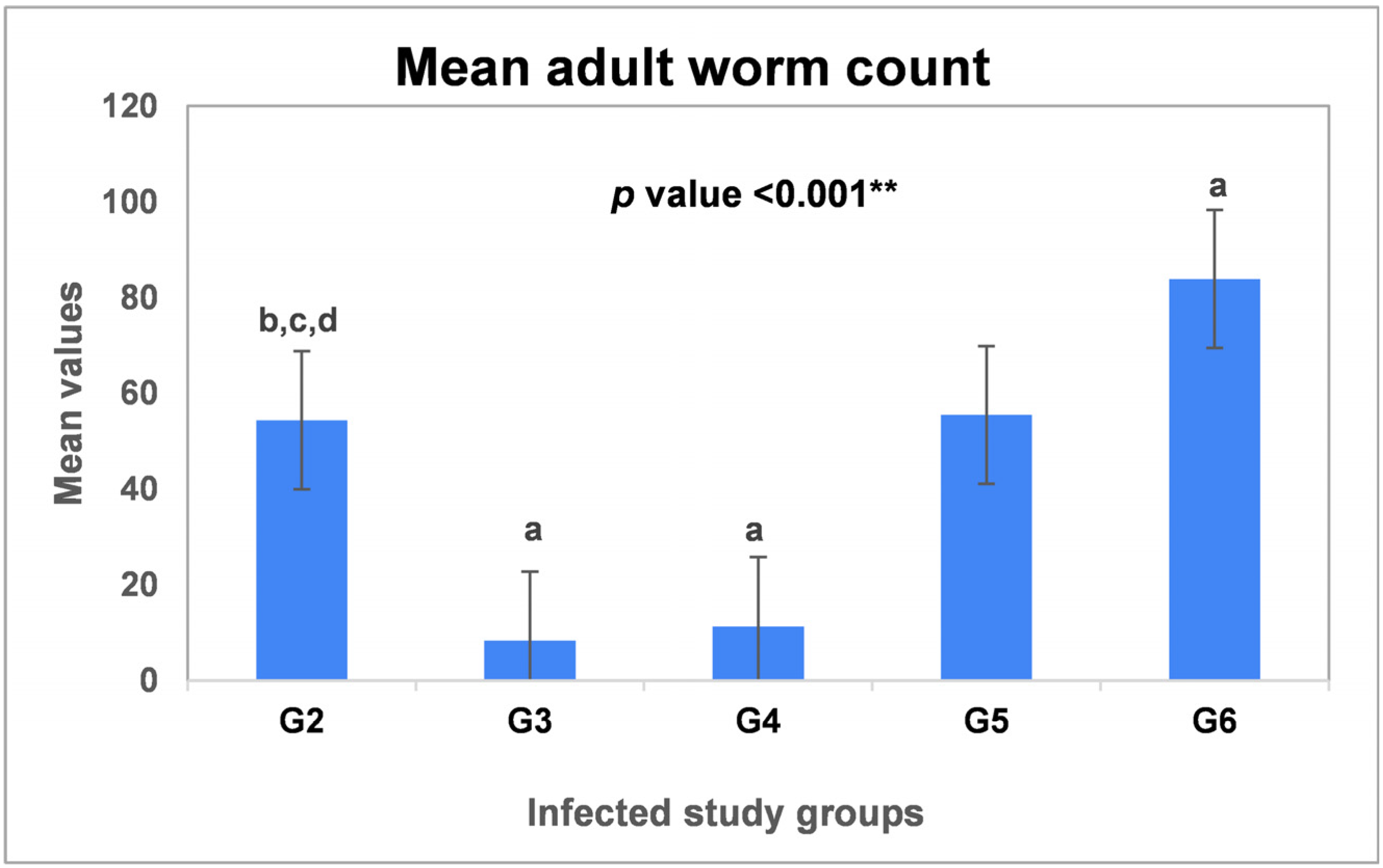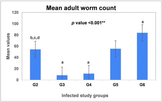Figure 1. Mean adult worm counts of T. spiralis in the intestinal sections of the infected groups. G2: Infected untreated group; G3: Infected–Albendazole-treated; G4: Infected–L-arginine-treated group; G5: Infected–Aminoguanidine-treated group, and G6: Infected–7-Nitroindazole-treated group. Data were analyzed using ANOVA with a post hoc analysis. Note: “a” indicates a significant difference vs. (G2) (p < 0.001 **), while “b” indicates a significant difference vs. (G3) (p < 0.001 **), “c” indicates a significant difference vs. (G4) (p < 0.001 **) and “d” indicates a significant difference vs. (G6) (p < 0.001 **).