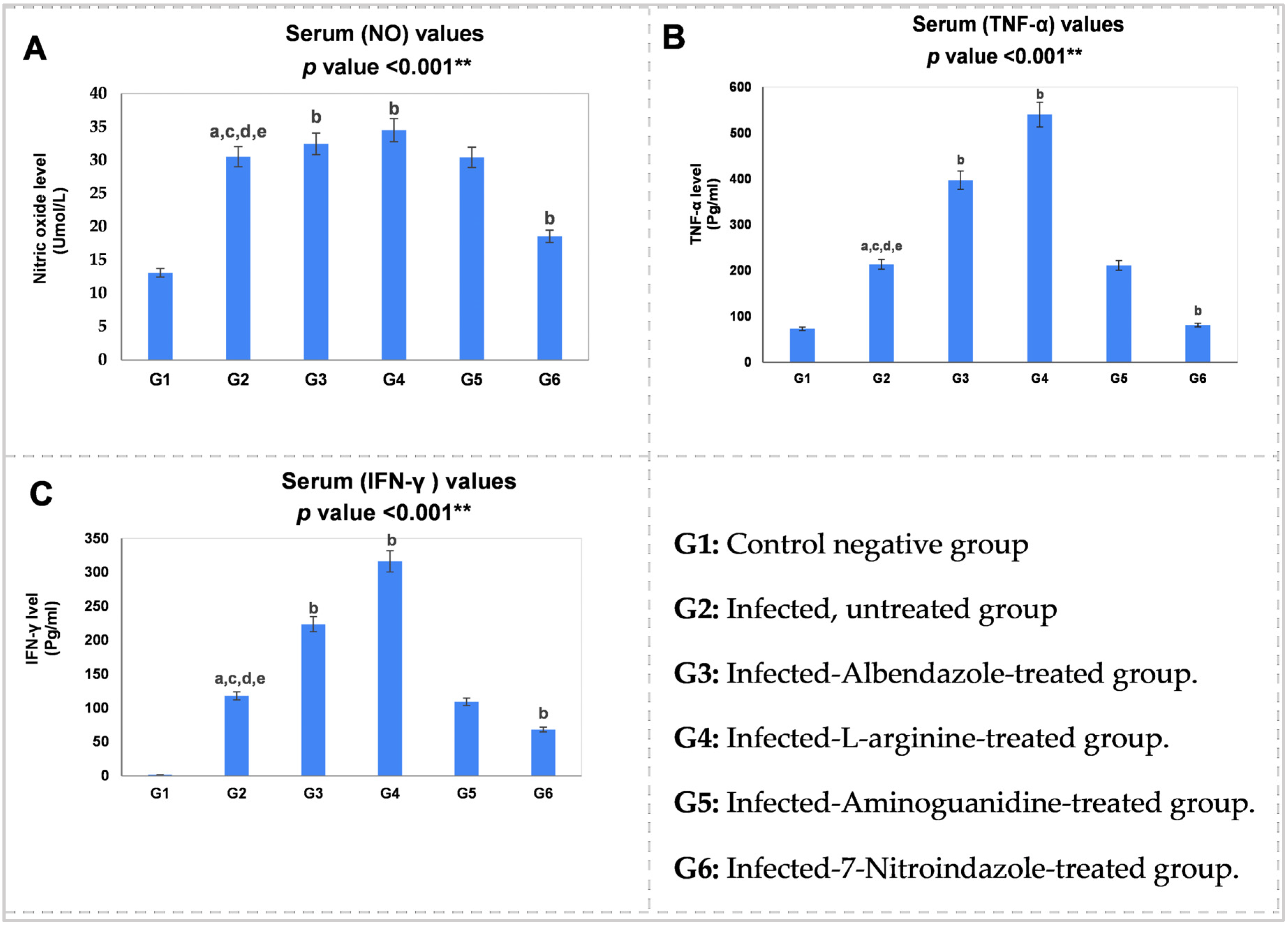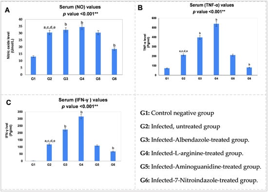 Figure 5. Statistical pairwise comparisons of the serum values of the proinflammatory mediators during the enteral phase of trichinosis: (A) serum nitric oxide (NO, Umol/L); (B) serum tumor necrosis factor-alpha (TNF-α, Pg/mL); (C) serum interferon-gamma (IFN-γ, Pg/mL). Data were analyzed using ANOVA with a post hoc analysis. Note: “a” indicates a significant difference vs. (G1) (p < 0.001 **), while “b” indicates a significant difference vs. (G2) (p < 0.001 **), “c” indicates a significant difference vs. (G3) (p < 0.001 **), “d” indicates a significant difference vs. (G4) (p < 0.001 **), and “e” indicates a significant difference vs. (G6) (p < 0.001 **).