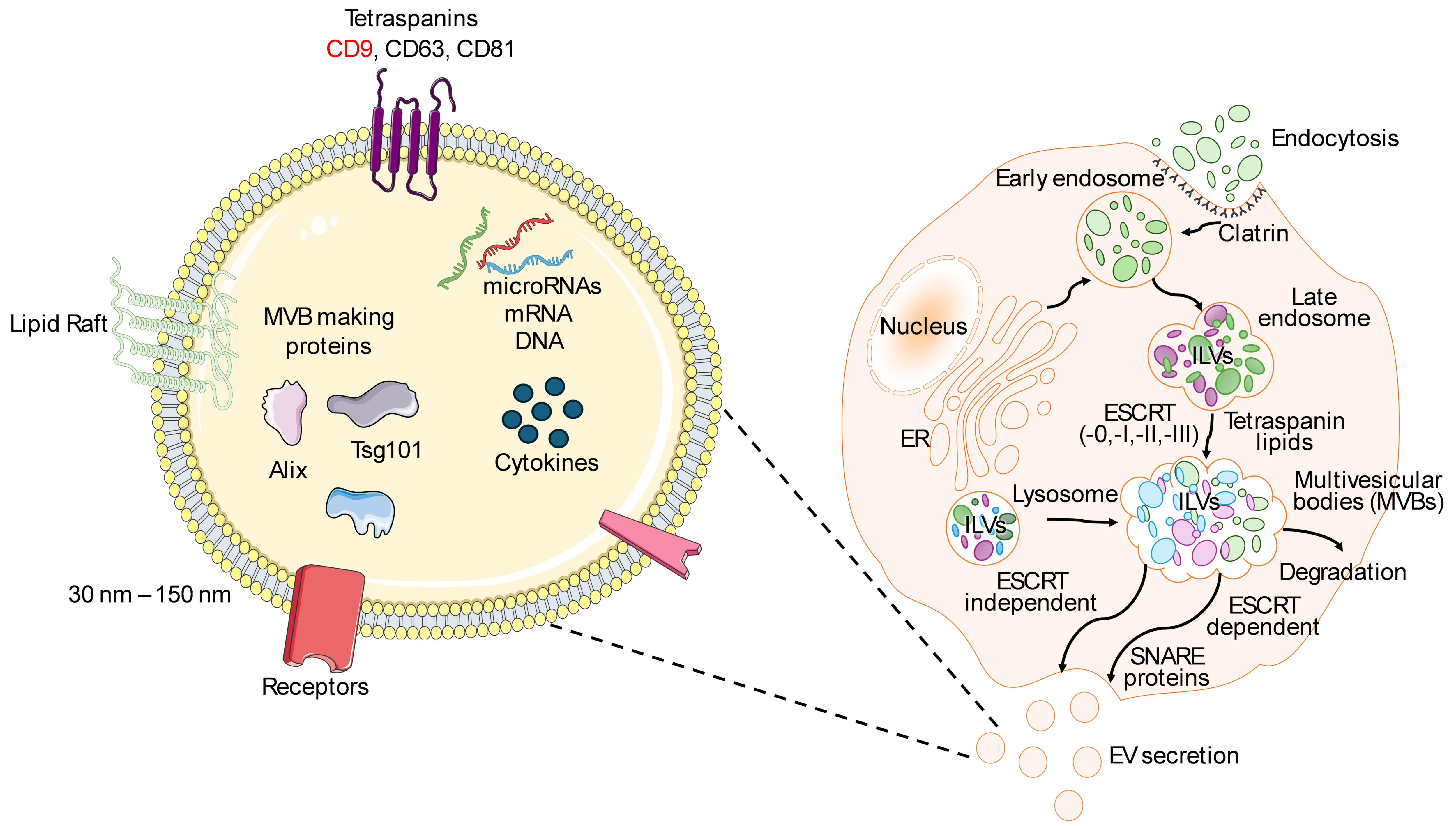 | Tetraspanins | CD9/CD63/CD81/CD82/CD37/CD53/CD151 | ESCRT-independent biogenesis, adhesion, cargo sorting | Membrane |