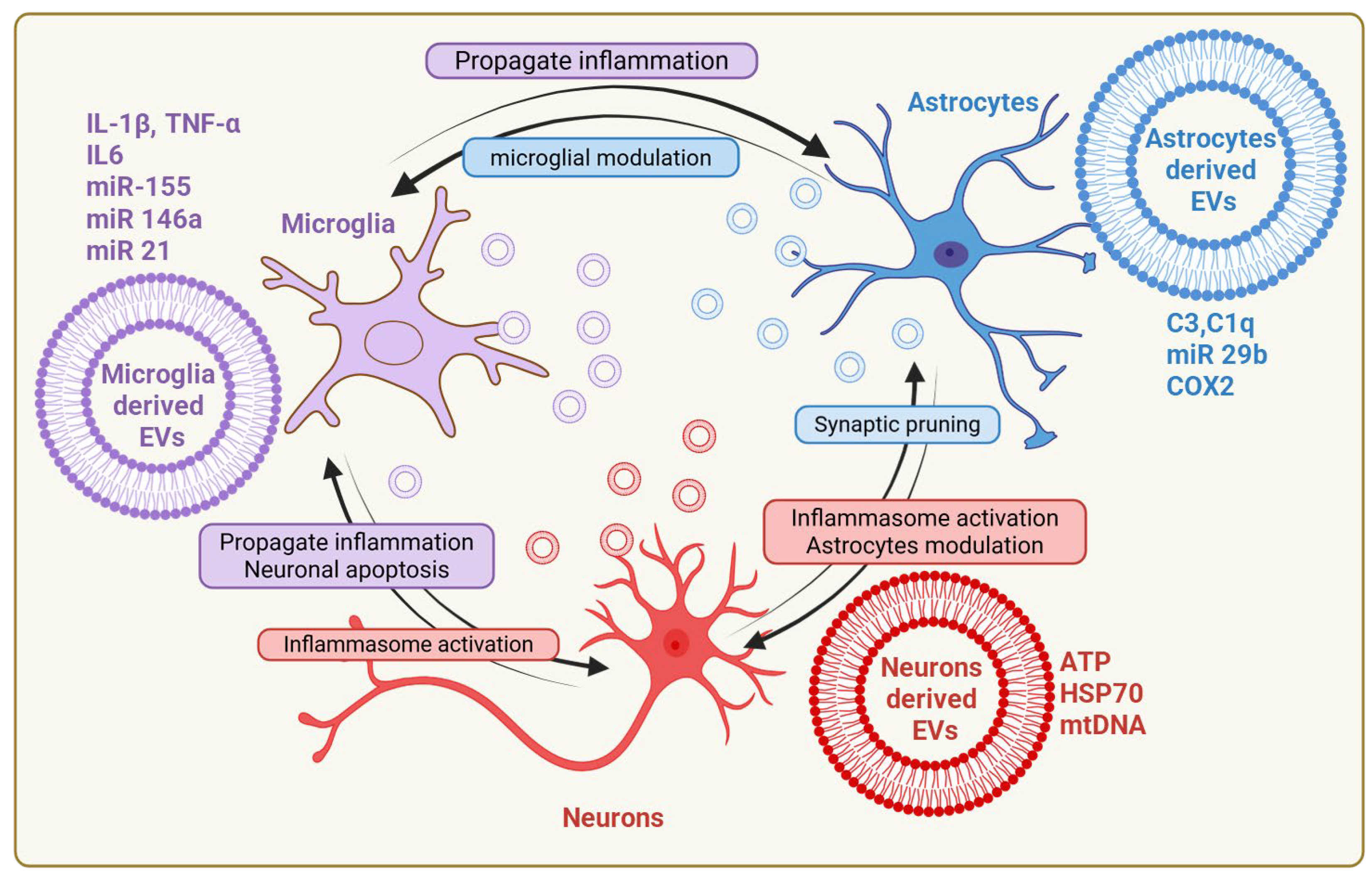 | Proteins (state-dependent cargo) | HSP70/90, inflammasome proteins (ASC, IL-1β), complement proteins | Propagate inflammatory signaling, modulate synaptic pruning, regulate stress responses. | [24,27,58,63] |