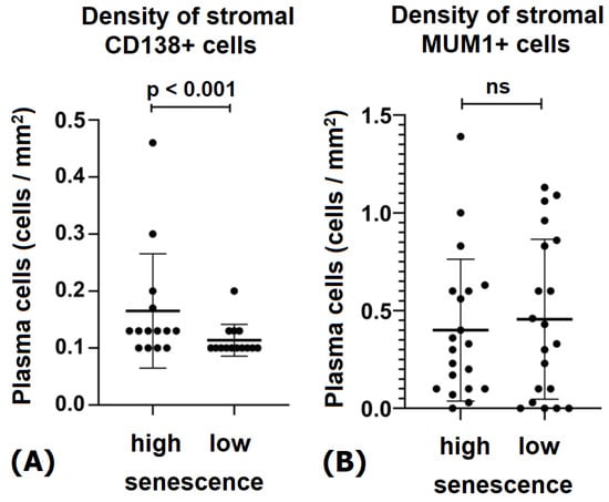 The density of plasma cells in endometrial stroma with low and high senescence. (A) Density of CD138+ plasma cells (cells/mm2). Data are presented as mean ± SD. (B) Density of MUM1+ plasma cells (cells/mm2). Black dots represent individual patient values; horizontal lines indicate mean values; “ns” denotes non-significant differences.