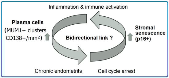 The interplay between stromal senescence and plasma cells may be bidirectional. On the one hand, SASP factors could facilitate plasma cell accumulation by sustaining a chronic inflammatory condition [22,39,40]. On the other hand, persistent inflammation and CE could induce stromal senescence, creating a vicious cycle [19,37,38]. Multi-omic analyses have also supported a link between cell aging, chronic inflammation and reproductive disorders [41]. This reciprocal interaction is conceptually illustrated in Figure 6.