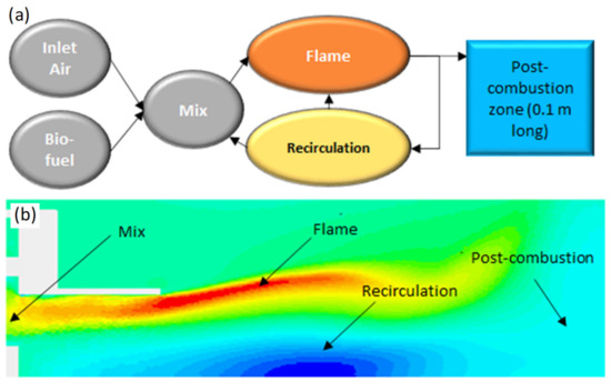 Combustion simulations were performed using a hybrid of Perfectly Stirred Reactors-Plug Flow Reactor (PSR-PFR). This network assumes adequate mixing and flow characteristics representative of swirling gas turbine combustors [38]. PSR–PFR consists of two clusters; the first section is comprised of three distinct zones, namely a mixing zone for partial premixing of fuel, a flame region directly connected to the former and the central recirculation zone (CRZ) for combustion products recirculation [31,32]. Recirculation rates in PSR are approximated to 20% of the combustion products [39,40,41]. The second cluster is a PFR (Plug Flow Reactor) for post-flame operation along a 0.1 m duct [42], Figure 1.