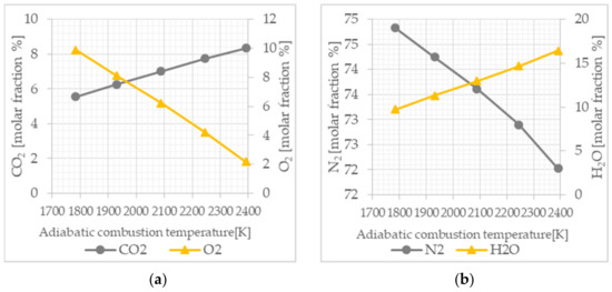 Composition change of the combustion products (a) carbon dioxide and oxygen and (b) nitrogen and water vapor as a function of adiabatic combustion temperature for CCGG combustion.