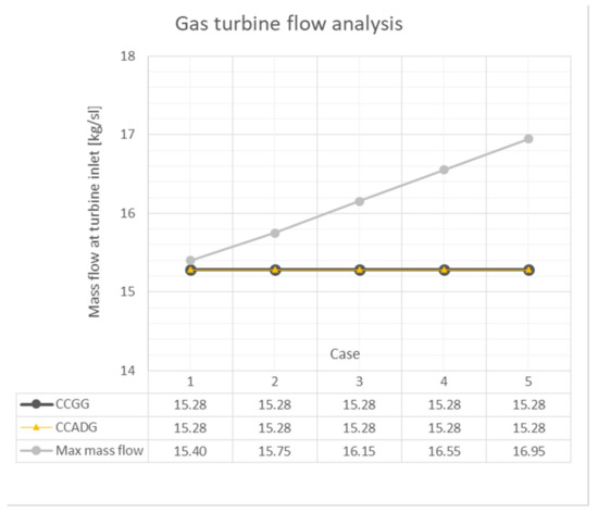 Maximum possible flow rates through the gas turbine, for CCGG and CCADG, respectively, compared to the maximum mass flows through the gas turbine calculated for natural gas.