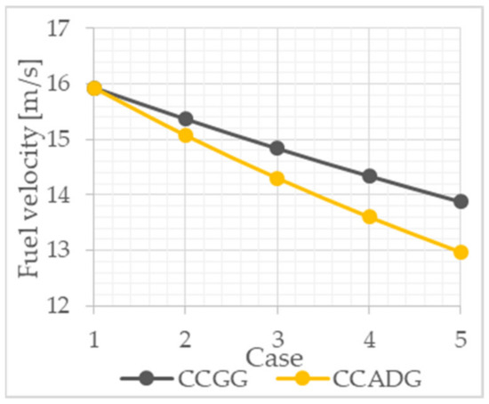 Regarding the fuel propulsion, analyses show that fuel velocity for all cases is at their maximum permissible value of 20 m/s [45], Figure 15; therefore, is not necessary to modify the fuel system to separate fuel entries [46].