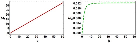 The variation of vs. k (left panel) and vs. k (right panel) when other plasma parameters are , , , , and .