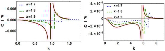 where and . It is interesting that P and Q of Equation (28) are the function of various plasma parameters such as carrier wave number (k), ratio of ion mass to dust mass (), ratio of dust charge state to ion charge state (), and super-thermal parameter (), etc.