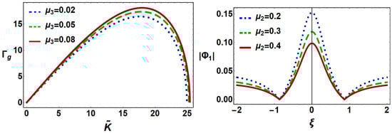 We have numerically analyzed the variation of the MI growth rate () of DIAWs with for different values of under consideration of fast mode shown in the left panel of Figure 3 by using these following plasma parameters: , , , , and , and it is clear from this figure that the , initially, increases with , and becomes maximum for a particular value of (i.e., ), then decreases to zero (i.e., ). The maximum value of the increases (decreases) with the dust (ion) charge state for a fixed value of dust and ion number density (via ). In our present investigation, we have considered the thermal effects of ions as well as the moment of inertia of ions along with negative dust grains. So, it is important to examine how the dynamics of the plasma system changes due to the consideration of thermal effects as well as the moment of inertia of positive ions along with negative dust grains. We have numerically analyzed Equation (32) in the right panel of Figure 3 to observe the effects of ion temperature (via ) to the formation of first-order DIARWs. The amplitude and width of the first-order DIARWs decrease with the increase in the value of the ion temperature () for a fixed value of ion charge state () and electron temperature (). The physics behind this result is that the nonlinearity as well as the amplitude of the first-order DIARWs decrease with ion temperature. So, under consideration of the thermal effect of inertial positive ion significantly changes, the dynamics of the plasma medium, and this finding agrees with the previous work [54].
