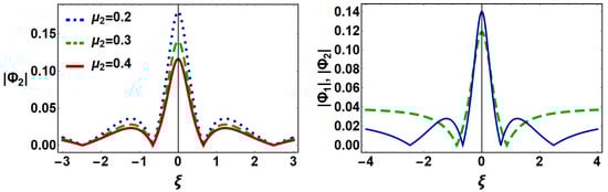 where , , and . In Equation (19) and (20), to get the positive value of , the condition must be satisfied. In the fast DIA mode, both inertial ion and dust oscillate in phase with the inertialess electrons. While in the slow DIA mode, one of the inertial elements ion (dust) oscillates in phase with the inertialess electrons, and other inertial element dust (ion) oscillates in anti-phase with them [40,41]. Both the fast and slow DIA modes have been analyzed numerically in Figure 1 in the presence of super-thermal electrons. Figure 1 (left panel) shows that the frequency of the DIAWs can be higher than ion–plasma frequency. In this regard, we note that in the absence of dust, the frequency of the ion–acoustic waves is always less than the ion–plasma or ion–Langmuir frequency. However, the phase speed of the DIAWs increases with the magnitude of the dust charge () and dust number density (). This is due to the extra space charge electric field created by the highly negative charged dust grains. This is theoretically predicted by Shukla and Silin [42], and experimentally observed by Barkan et al. [43]. Thus, as the magnitude of the dust charge () or dust number density () increases, the frequency of the DIAWs increases; even it can exceed the ion–plasma or ion–Langmuir frequency. On the other hand, the dispersion curve of the slow DIA mode shown in Figure 1 (right panel) clearly indicates that the frequency of the slow DIA mode is always less than the ion–plasma or ion–Langmuir frequency even in the presence of highly negatively charged dust. The second-order (when with ) equations are given by