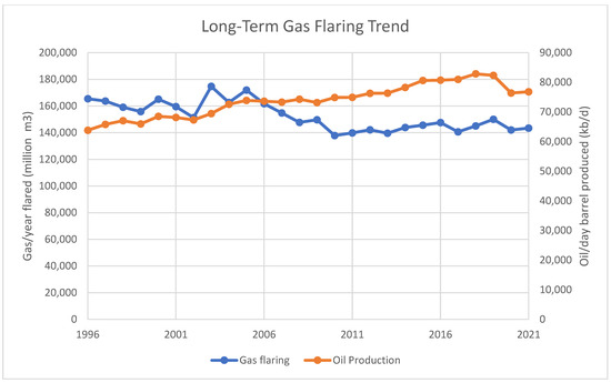 Flaring in Nigeria is linked to the first-ever hydrocarbon export from Nigeria [24]. According to the Department of Petroleum Resources, Nigeria has 159 oil fields and 1481 wells in operation [25,26]. With an estimated 37 billion barrels of proven crude oil reserves, Nigeria has the second largest crude oil reserves in Africa, behind Libya [27,28]. Despite remaining in the top seven flaring countries, Nigeria has reduced its gas flaring by 70% over the last 15 years. From 2012 to 2021, Nigeria reduced flaring by 31% and increased flare intensity by 10% [14]. In addition, oil production has remained essentially steady at around 2 million barrels per day [18].