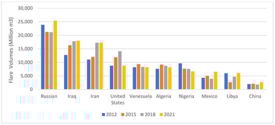 Flare volumes for the top 10 flaring countries for 2012, 2015, 2018, and 2021 [14].