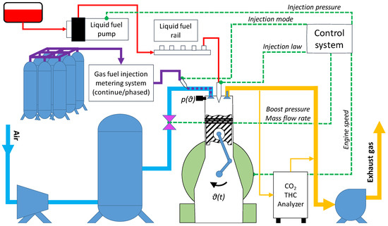 The experimental apparatus is shown in Figure 1. An external supercharging system provides air intake, with a throttling globe valve controlling the boost pressure. The pilot liquid fuel is injected directly into the combustion chamber at controlled pressure and injection law, while the main gaseous fuel is injected into the intake manifold. An eddy current brake is set to fix the speed of the motor regardless of the torque delivered. In addition to the torque measured by the brake, a pressure sensor in the combustion chamber coupled to an angle encoder with an accuracy of 0.5 CAD is used to acquire the indicated cycle and evaluate the indicated mean effective pressure (IMEP) delivered by the engine.
