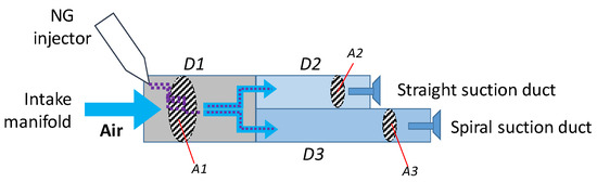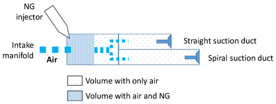 A reasonably accurate estimate of the time needed to travel the distance from the NG injection point to the cylinder was performed using a simplified model of the intake manifold geometry, as shown in Figure 2.