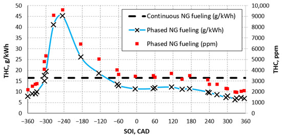 THC in continuous NG fueling and with phased injection at varying gas SOI at 1500 rpm and a boost pressure of 1.5 bar.