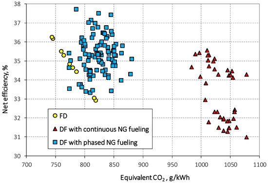 As previously highlighted, to achieve optimal operating conditions through the correct setting of various control parameters, both for gas injection and pilot diesel injection, it is necessary to consider certain trade-offs among the parameters listed in Table 4. A significant trade-off exists between efficiency and equivalent CO2 emissions, as shown in Figure 4. Switching to phased injection allows DF performance to approach that of FD, provided the pilot diesel injection settings are optimized. The data cloud was obtained using different control parameter settings. With the phased injection, DF operation can achieve slightly higher net efficiency values than those measured in FD (by about 5%), with equivalent CO2 emissions similar to those recorded in FD. Moreover, considering that the optimal equivalent CO2 results in FD generally correspond to conditions of higher NOx emissions, a trade-off in the FD scenario might lead to selecting conditions with higher equivalent CO2 emissions. Therefore, DF fueling could ensure similar equivalent CO2 emissions while maintaining the same NOx levels. As a consequence, choosing operating conditions in FD with optimal efficiency may require the use of selective catalysts to mitigate NOx emissions. Once again, the DF supply could be optimized with greater flexibility. Indeed, in the DF mode, higher exhaust temperatures are expected because of the lower air index used, thereby favoring NOx conversion into the catalysts.
