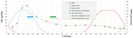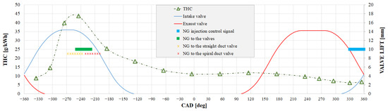The results of the tests with variable NG injection timing are shown in Figure 3, where the TDC at the end of the compression stroke corresponds to the zero point on the abscissa. The THC values are plotted in correspondence with the CAD at which the electrical impulse for injector activation is initiated. The air/gas mixture formed in the intake manifold enters the cylinder only after several rotation angles from this impulse. The values of this lag due to the physics of the process and the characteristics of the experimental system will be discussed later. In the figure, a section with small variations can be observed starting from approximately 60 CAD BTDC to approximately 180 CAD ATDC (after top dead center), and then reaching optimal values, approximately one-third of the values measured with continuous admission, around TDC in the exhaust phase. It is also important to note that the maximum THC value (about 45 g/kWh at 255 CAD) can be up to approximately three times higher than the emissions recorded with continuous manifold feeding.