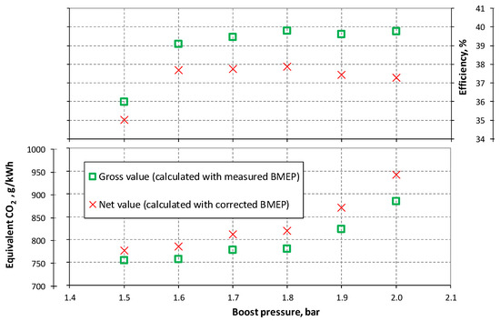 Efficiency and equivalent CO2 trend as boost pressure varies in DF. Net and gross values.