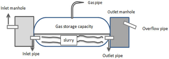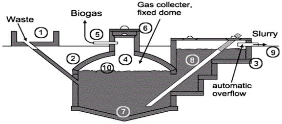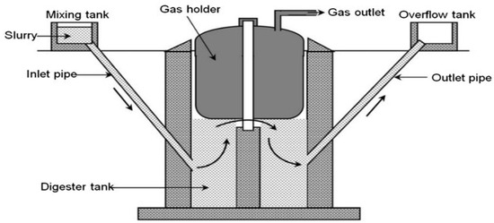 - Mushtaq, K.; Zaidi, A.A.; Askari, S.J. Design and performance analysis of floating dome type portable biogas plant for domestic use in Pakistan. Sustain. Energy Technol. Assess 2016, 14, 21–25. [Google Scholar] [CrossRef]