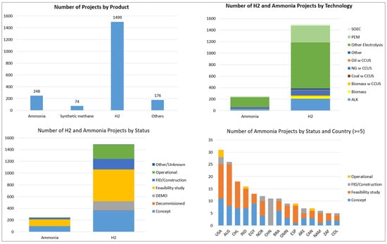https://www.iea.org/data-and-statistics/data-product/hydrogen-production-and-infrastructure-projects-database (accessed on 28 July 2024)). While fewer than hydrogen projects, ammonia projects still represent a significant portion of the capacity, including a growing interest in using ammonia as a hydrogen carrier. Most of these ammonia projects are associated with natural gas plus CCS, reflecting the current reliance on fossil fuels paired with carbon capture technologies. Countries like the US, Australia, and Norway are the forerunners of these ammonia projects. Future research should focus on exploring (1) how the emerging LCIA market will shape the global hydrogen economy, and (2) how the global hydrogen and ammonia trade relationships may evolve as the US enhances its domestic supply chains.