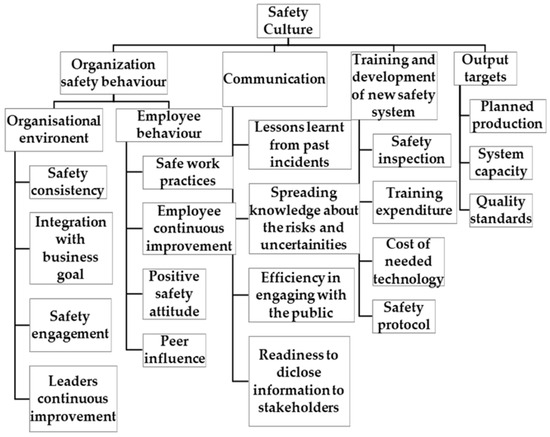 The concept of safety culture emerged following the 1986 Chernobyl incident [20]. In this context, an “incident” is an occurrence that has happened unintentionally, which may not lead to any damage, injuries, or any other harm, while an “accident” is an incident that occurs unintentionally and may lead to damage, injury, or harm. The common thread among major accidents is that all of them involved significant failures of complex socio-technical systems. This pinpoints issues within the organization’s “safety culture” as a key contributing factor, reflecting broader problems in the organizational culture. No widely agreed-upon definition of safety culture comprehensively includes all viewpoints [21]. Despite this, identifiable elements allow for the formulation of a definition of safety culture as a collection of shared values [22]. Consensus in safety culture is an element of organizational culture that is often defined as “the integration of the individual and group values, attitudes, competencies and patterns of behaviour that determine the commitment to, and the style and proficiency of, an organization’s health and safety programs” [23]. The safety culture within an organization is visible through the actions of its management and employees in prioritizing the elimination or reduction in workplace hazards [24]. This culture includes the following components:
