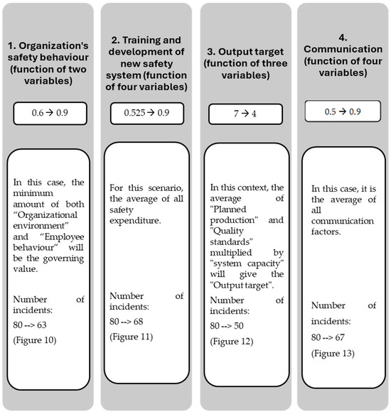 The impact of safety culture on blue hydrogen production is crucial for protecting the health of workers, preserving the environment, and supporting operational reliability. A strong safety culture facilitates the adoption of hard safety measures, comprehensive risk assessments, and effective emergency response plans across all stages of hydrogen production. Highlighting safety enables organizations to prevent incidents, reduce operational disruptions, and encourage confidence among stakeholders. Ultimately, a positive safety culture promotes a sustainable and responsible approach to producing blue hydrogen. The what-if analysis will help in determining which of the safety culture dimensions has the most influence on safety performance and the number of incidents in blue hydrogen. The what-if analysis aims to identify which dimension of safety culture exerts the greatest influence on safety performance and incident frequency in blue hydrogen production. The scenarios are shown in Figure 9.