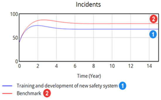 Organizational commitment has been identified as a crucial factor positively influencing job performance, as it is widely recognized as a key determinant of achieving high performance levels. Additionally, the implementation of effective safety procedures and risk management practices has also been shown to significantly enhance job performance. This highlights the importance of encouraging a strong organizational commitment and prioritizing safety measures to optimize overall performance in the workplace [42]. Enhancing employees’ views of management’s actual care for their well-being by prioritizing safety can lead to favourable results beyond just better safety performance. These outcomes suggest a form of social interaction between employees and management that could impact employees in a way, such as apparent organizational support. A company’s leader must show that they care about safety. Businesses that focus on safety could have fewer accidents and notice better employee moods and actions [43]. The impact of improvement in organizational safety behaviour on the number of incidents is shown in Figure 10.