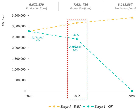 To build the transition pathway, it is essential to assess the projection of CO2 emissions for the Italian glass sector in the BAU (Business as Usual) scenario until 2035 and 2050, divided between Scope 1 and Scope 2 emissions. The first step in constructing a decarbonization strategy is projecting CO2 emissions for both the “mid-term” 2035 and “long-term” 2050, based on baseline data and the expected Compound Annual Growth Rate (CAGR) for sector production. The CAGR represents the average percentage growth of a quantity over a period of time [33].