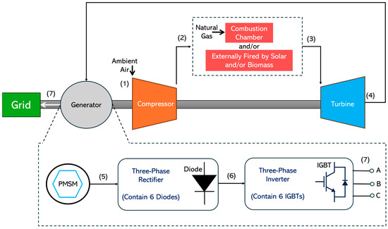Micro gas turbines comprise two principal subsystems, a mechanical and an electrical subsystem. As seen in Figure 1, the mechanical part includes a combustor and a compressor and turbine mounted on a single shaft, whereas the electrical subsystem is composed of a permanent magnet synchronous machine (PMSM) and power electronics modules, such as bidirectional power converters or a rectifier and an inverter. During operation, the compressor pressurises ambient air (1), which is then directed into a recuperator to recover heat from the exhaust gases. This heated air is then mixed with fuel (or is heated externally in externally fired MGTs) before combustion (2). The resulting high-temperature gas (3) expands through the turbine, which drives both the compressor and the generator (4). Electricity is ultimately conditioned for delivery at the required voltage and frequency by the power electronics, thus enabling connection to the grid or local loads. More specifically, the PMSM generates a variable-frequency, unregulated AC voltage (5) that cannot be fed directly to the grid. Consequently, it is first routed through a three-phase rectifier to convert the output to DC (6); this DC link is then supplied to a three-phase inverter, which synthesises a three-phase AC voltage, denoted phases A, B and C, whose frequency and magnitude are compatible with the grid (7). A thorough description of power transmission and control in the electrical subsystem of micro gas turbines is presented in a previous work by the author of this article [5].