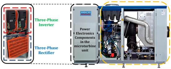 The AE T100 micro gas turbine is a small-scale power generation system rated at 100 kW, designed for various distributed energy applications. According to the manufacturer’s specifications [23], the entire AE T100 system occupies a total physical volume of 4.51 m3. Within this total volume, different subsystems work together to produce electrical power efficiently and reliably. One key subsystem is the inverter, which converts the turbine’s mechanical energy into a usable electrical form.