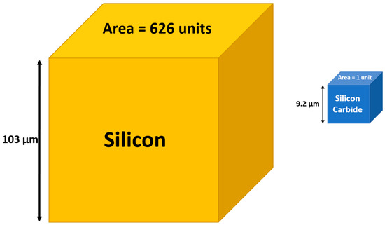Silicon carbide devices are characterised by higher critical electric fields, better thermal conductivity, and greater tolerance for high-temperature operation than conventional silicon devices [12,13]. As shown in Figure 3, the drift layer thickness of a 1200 V silicon carbide (in blue) metal–oxide–semiconductor field-effect transistor (MOSFET) is markedly smaller than that of its silicon (in yellow) counterpart [14]. Table 1 confirms these differences by demonstrating that silicon carbide can deliver a notably reduced footprint.