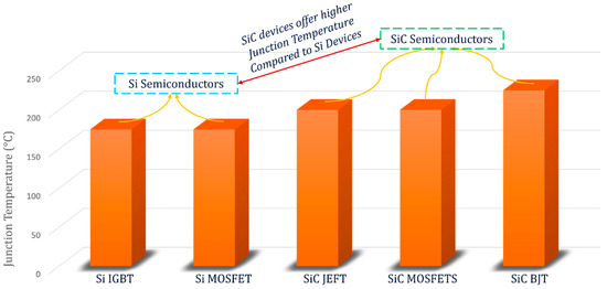 In 2001, Infineon developed the first commercial silicon carbide diode, offering improved thermal stability and reduced reverse recovery time. This milestone paved the way for the development of silicon carbide power devices in the field of power electronics. Since then, a growing number of standalone devices and power modules have steadily emerged [15,16,17,18]. GeneSiC and Micross Components now offer silicon carbide transistors capable of operating at junction temperatures of up to 210 °C [19]. Additionally, some silicon carbide discrete devices and integrated circuits have been demonstrated, under laboratory conditions, to operate at temperatures exceeding 500 °C for short durations [20]. Figure 4 compares the maximum operating temperatures of currently available silicon and silicon carbide power electronic devices. The data presented are drawn from reference [19].