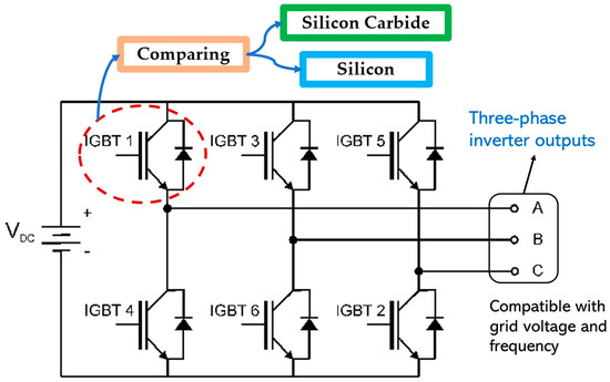 The inverter selected for this study is a three-phase system containing six IGBTs, as shown in Figure 5. A, B and C denote the three-phase voltages produced by the inverter, whose frequency and magnitude are compatible with the grid. The specific IGBT modules chosen for comparison were the conventional silicon IGBT module (CM200DY-24TH) [21] and the silicon carbide hybrid IGBT module (CMH200DU-24NFH) [22], both manufactured by Mitsubishi Electric, Tokyo, Japan. These modules were carefully selected due to their comparable voltage and current ratings (1200 V, 200 A), enabling a fair and direct comparison between traditional silicon and advanced silicon carbide-based technologies. Additionally, detailed datasheets are available, providing comprehensive electrical, thermal, and mechanical characteristics essential for accurate and realistic modelling. Importantly, these selected modules align closely with the operational requirements of the AE T100 micro gas turbine, particularly in terms of voltage ratings, current handling capability, and switching frequency characteristics, ensuring the compatibility and practical relevance of this study’s findings for real-world applications.