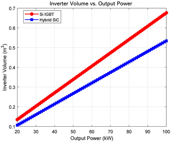 The methodology above is implemented through a MATLAB (R2021b) script developed to examine the effects of substituting conventional silicon IGBTs with hybrid silicon carbide IGBTs in the inverter of AE T100 micro gas turbine. Although the AE T100 is nominally rated at 100 kW and occupies a fixed physical volume of around 4.51 m3 at that rating, the graphical results in this chapter span an illustrative range from 20 kW to 100 kW. The purpose of this broader examination is to demonstrate how inverter volumes and power densities might change under varying loads, thereby providing insights into partial-load scenarios. It is important to note that the micro gas turbine’s physical structure does not actually contract or expand in direct proportion to the output power level; the turbine components are largely fixed in size and only the operating conditions are adjusted for different loads. Nevertheless, this conceptual scaling exercise serves to highlight how replacing silicon IGBTs with silicon carbide IGBTs can influence inverter performance and power density under different power demands. By drawing comparisons between silicon-based and silicon carbide-based inverters at lower outputs, it is possible to gain a clearer picture of their relative advantages, such as potential improvements in power density or reductions in thermal management requirements.