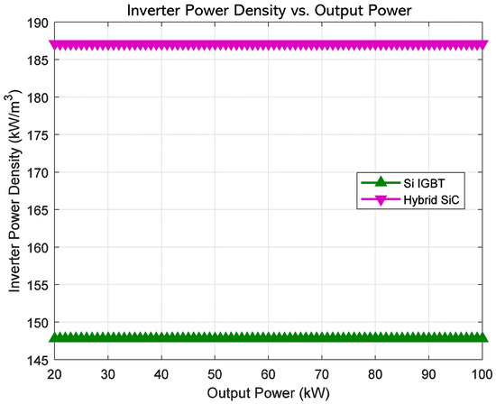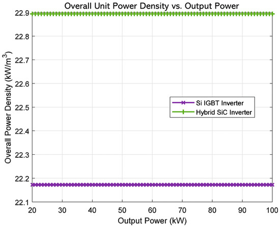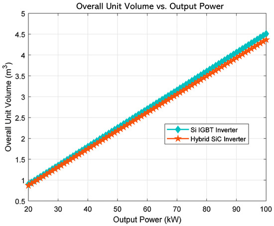 Upon computing the volumes and power densities for both conventional silicon and hybrid silicon carbide inverters over the specified output power range, a detailed examination of these findings is involved. A range of graphical plots is produced to showcase the inverter and overall unit volumes across the defined power levels, offering a straightforward means to compare how each design approach scales in physical size. Similarly, power density graphs are generated, highlighting how effectively each inverter, together with the AE T100 micro gas turbine, converts its footprint into usable output power. The study quantifies the direct impact of substituting conventional silicon devices with hybrid silicon carbide modules. This methodology presented in this article offers a robust framework for assessing the potential benefits and quantifying the effects of adopting hybrid silicon carbide IGBTs in micro gas turbine inverter applications in terms of size reduction and power density enhancement. By taking into account not only inverter-level parameters but also system-wide considerations, such as cooling requirements, the analysis captures the essential trade-offs that designers face when looking to improve power density, reduce footprint, or enhance thermal performance.