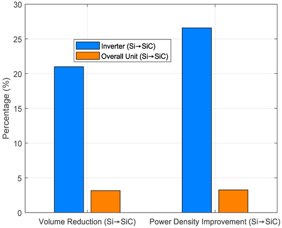 Figure 10 presents a concise bar chart that compares the conventional silicon design against the silicon carbide counterpart precisely at the AE T100′s nominal 100 kW operating point, where this micro gas turbine is typically intended to function. The analysis indicates that switching from silicon IGBTs to silicon carbide devices can reduce the inverter volume by about 21–22 per cent, a change that translates into a 26–27 per cent boost in inverter-level power density. Thereby, the total AE T100 volume contracts by approximately 3.1 per cent, resulting in an increase of around 3–3.3 per cent in the overall power density of the overall system. Admittedly, these gains at the full system level are more modest than the dramatic improvements seen specifically within the inverter. Nevertheless, they serve as a clear demonstration of how adopting silicon carbide technology can lead to more compact and higher-density designs. The results only account for changing the inverter’s transistors from silicon to silicon carbide. Should the rectifier stage be similarly upgraded, by replacing the silicon diodes with silicon carbide equivalents, further reductions in conduction losses and decreases in cooling requirements might yield even larger enhancements in both inverter and overall system performance.