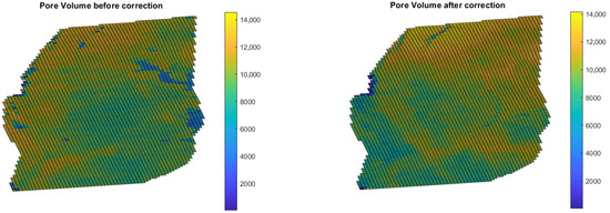 Initial Average pore volume [m3] distribution in MRST (left); modified pore volume distribution (right).