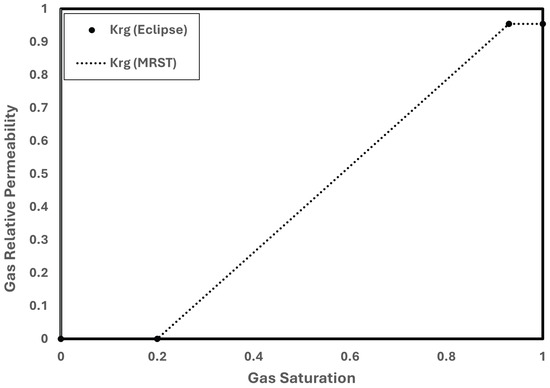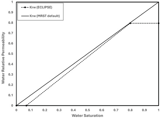 The water relative permeability model in MRST and Eclipse is displayed in Figure 6. With zero irreducible water and residual gas saturations, the default water relative permeability in MRST is a linear function of saturation with a slope of one. Eclipse, on the other hand, has residual gas saturation and irreducible water saturation values of 0.2 and 0.07, respectively.