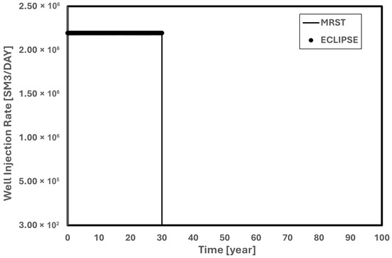 To ensure that the injection rates in MRST and Eclipse are the same, Figure 8 compares this parameter. It is evident that the injection rates in MRST and Eclipse are the same throughout the injection time.