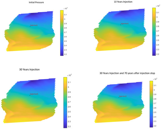 Given the equilibrium state of the Johansen–Cook formations, the initial pressure is 260 [bar] at a datum depth of 2600 m. Analyzing the pressure prior to, during, and following the injection procedure is a crucial part of the CO2 injection research. The initial pressure distribution and injection well location in the Aurora model are shown in Figure 2.