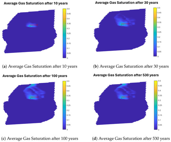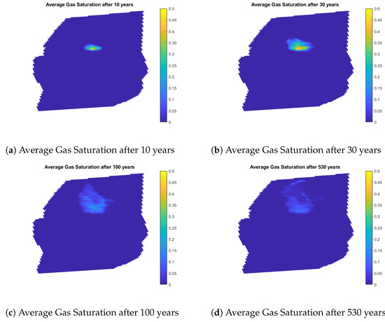 The shape of the CO2 plume is the main focus for comparing the CO2 plume migration patterns between the MRST and Eclipse models. For comparison, the gas saturation distribution from the 3D Eclipse model must be translated to a 2D grid model since the VE MRST-co2lab delivers findings in that format. By averaging the gas saturation for each column in Eclipse according to the pore volume of each cell in the column, this conversion is accomplished. To calculate the averaged gas saturation, the pore volumes and gas saturations of each cell are multiplied together, and the total of these products for each column is then divided by the column’s total pore volume. This procedure makes it possible to compare the 2D MRST model with the 3D Eclipse model.