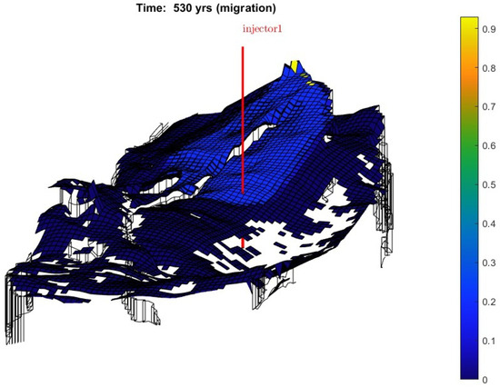 There are 1,216,800 cells in the grid (78 × 130 × 120), 747,890 of which are active cells. The cornerpoint structure from the Petrel SE software platform is used in the grid format. A comprehensive overview of all the static and fluid model properties for the Aurora injection location can be found in Table 1. The injection procedure takes place over a period of thirty years, and the migration of the CO2 plume that results has been studied for about five centuries.
