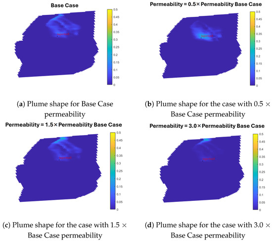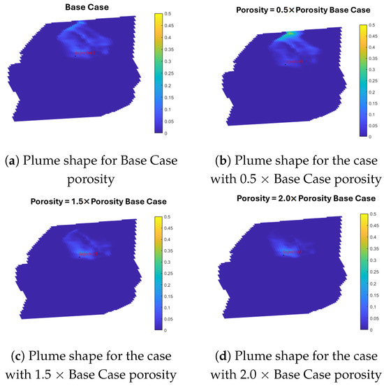 Plume shape in porosity sensitivity analysis after 50 years (20 years after injection stops).
