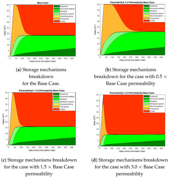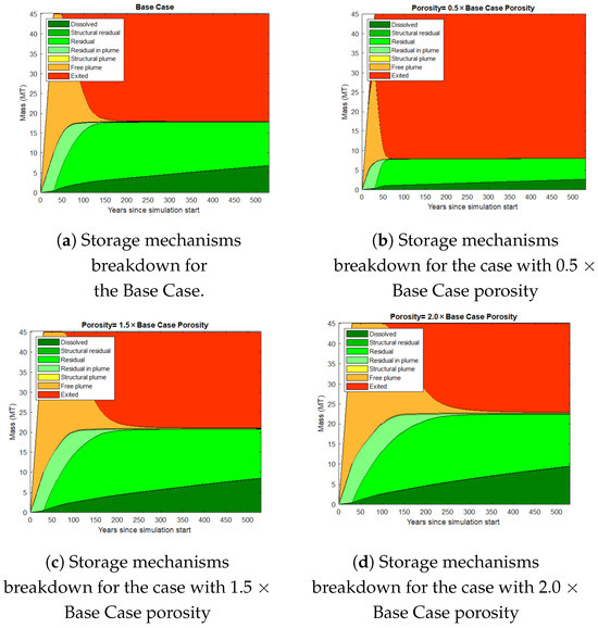 In comparison to lower porosity situations (a and b), Figure 24 illustrates that larger porosity scenarios (c and d) provide more CO2 storage through residual and dissolved mechanisms. A significant portion of the free plume escapes through the top barrier in the lower porosity instances.