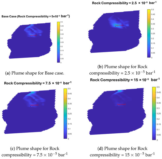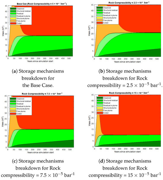 Notably, with a rock compressibility of , the rate of free plume evacuation from the upper boundary is highest, as high rock compressibility pushes the plume towards the boundary. As a result, the case with the highest compressibility has the lowest CO2 storage—roughly 10 [MT].