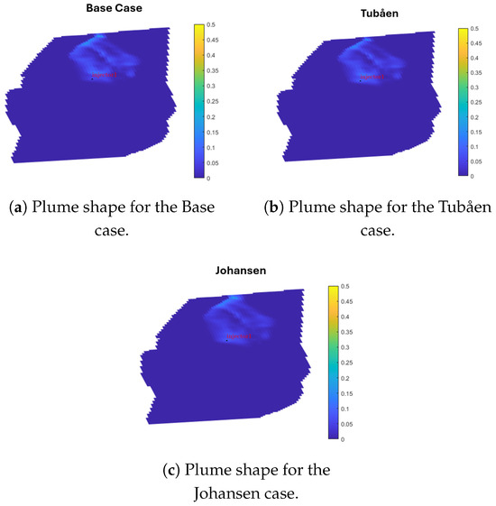 As can be seen in Figure 33, the base example has less residual trapped CO2 than the Tubåen and Johansen cases, since the residual gas saturation of the Base case (0.2) is lower than other two. Furthermore, the Johansen instance shows that the free CO2 plume migrates more quickly than in the other circumstances. The reason for this is that the Johansen example has the highest irreducible water saturation of the three different examples, which limits the amount of space available for injected CO2 and speeds up its migration towards the northern boundary.