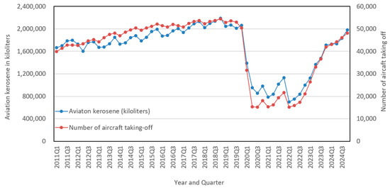 Number of aircraft taking off and aviation kerosene consumption from 2011Q1 to 2024Q4.